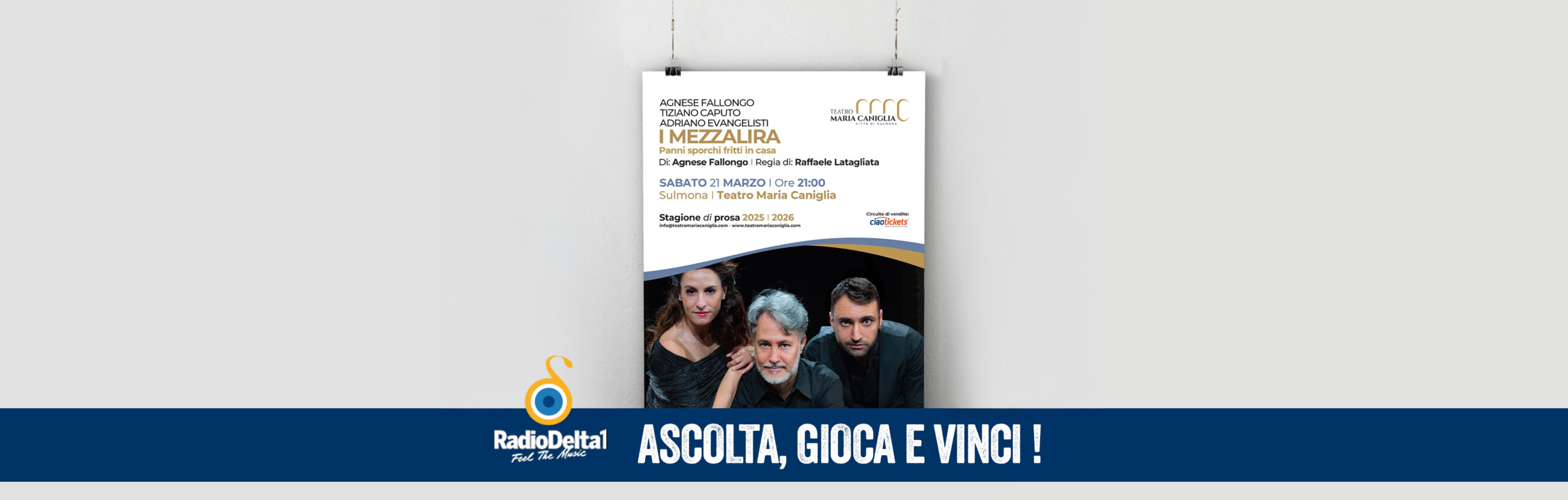 Radio Delta 1 ti porta a teatro con un appuntamento imperdibile: Pierfrancesco Favino in “Napoli-New York”, in programma domenica 15 marzo 2026 alle ore 18:00 al Cinema del Teatro Talia di Tagliacozzo. Ascolta Radio Delta 1, partecipa al gioco e prova a vincere il tuo ingresso per vivere una serata speciale tra emozione, spettacolo e grande cinema. Ascolta, gioca e vinci!