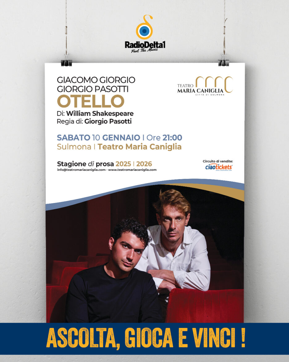 Radio Delta 1 ti porta a teatro con uno dei capolavori più intensi di William Shakespeare.🎭 “Otello”, con Giacomo Giorgio e Giorgio Pasotti, arriva al Teatro Maria Caniglia di Sulmona per una serata imperdibile.