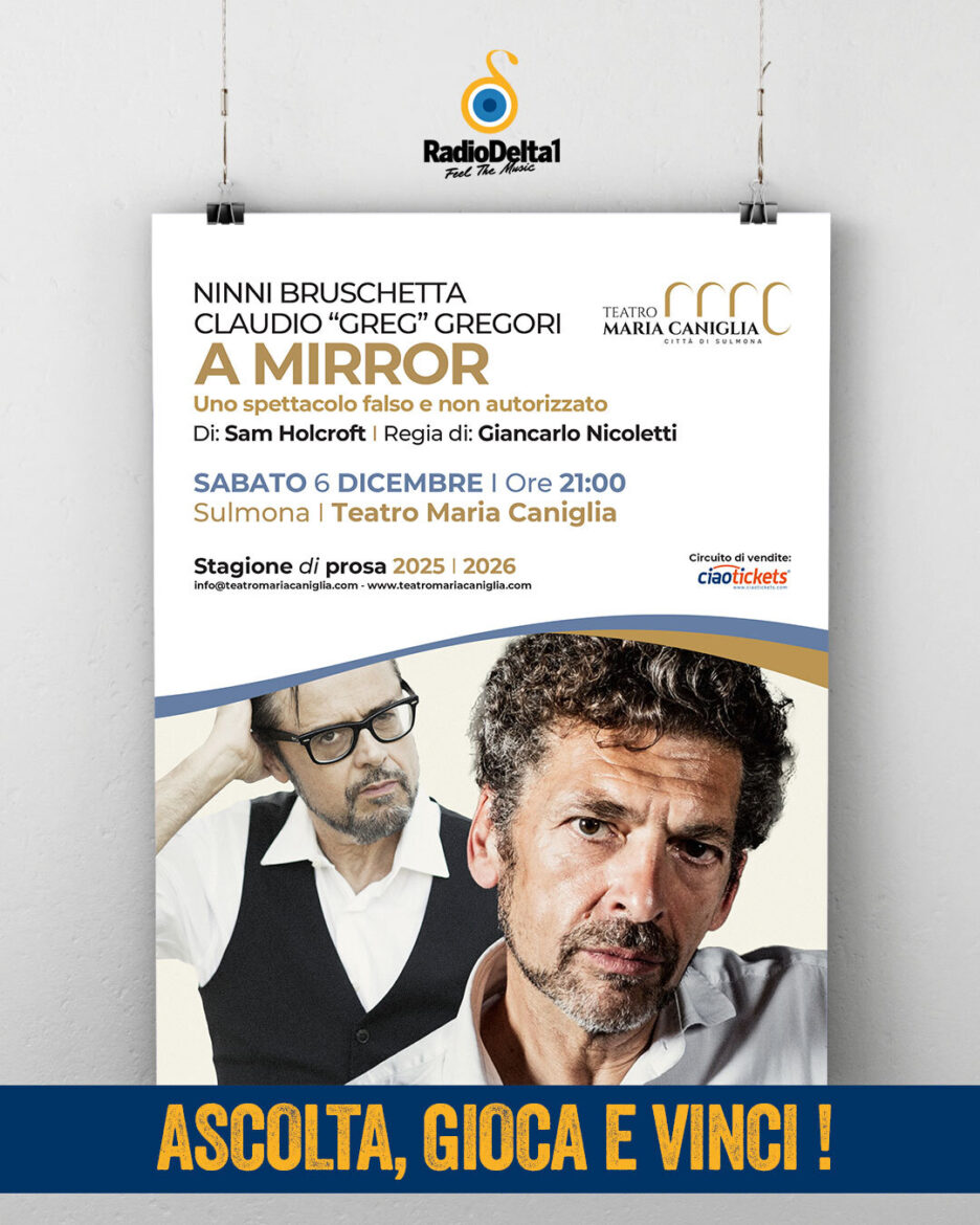 Il nuovo appuntamento della stagione di prosa 2025/2026 del Teatro Maria Caniglia di Sulmona porta in scena uno spettacolo intenso, ironico e decisamente fuori dagli schemi: “A Mirror”, con due protagonisti d’eccezione, Ninni Bruschetta e Claudio “Greg” Gregori. Un evento che unisce teatro contemporaneo, riflessione e comicità intelligente, e che Radio Delta 1 ha deciso di seguire da vicino con un’iniziativa speciale dedicata agli ascoltatori.