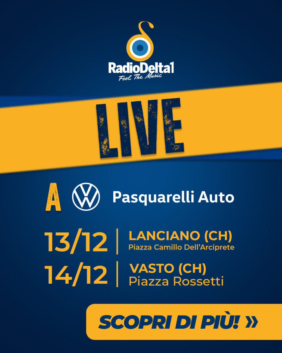 Siete pronti a guidare il futuro? Sabato 13 e domenica 14 dicembre, Pasquarelli Auto vi presenta il prossimo passo dell’innovazione Volkswagen! Arriva la nuova T-Roc 2026! Più dinamica, più tecnologica, semplicemente incredibile! E noi di Radio Delta1 ci saremo, in diretta, per celebrare questo lancio. Sabato 13 vi aspettiamo a Lanciano in Piazza Camillo Dell'Arciprete e domenica 14 a Vasto in piazza Rossetti. Saremo in diretta su Delta1, in entrambi […]