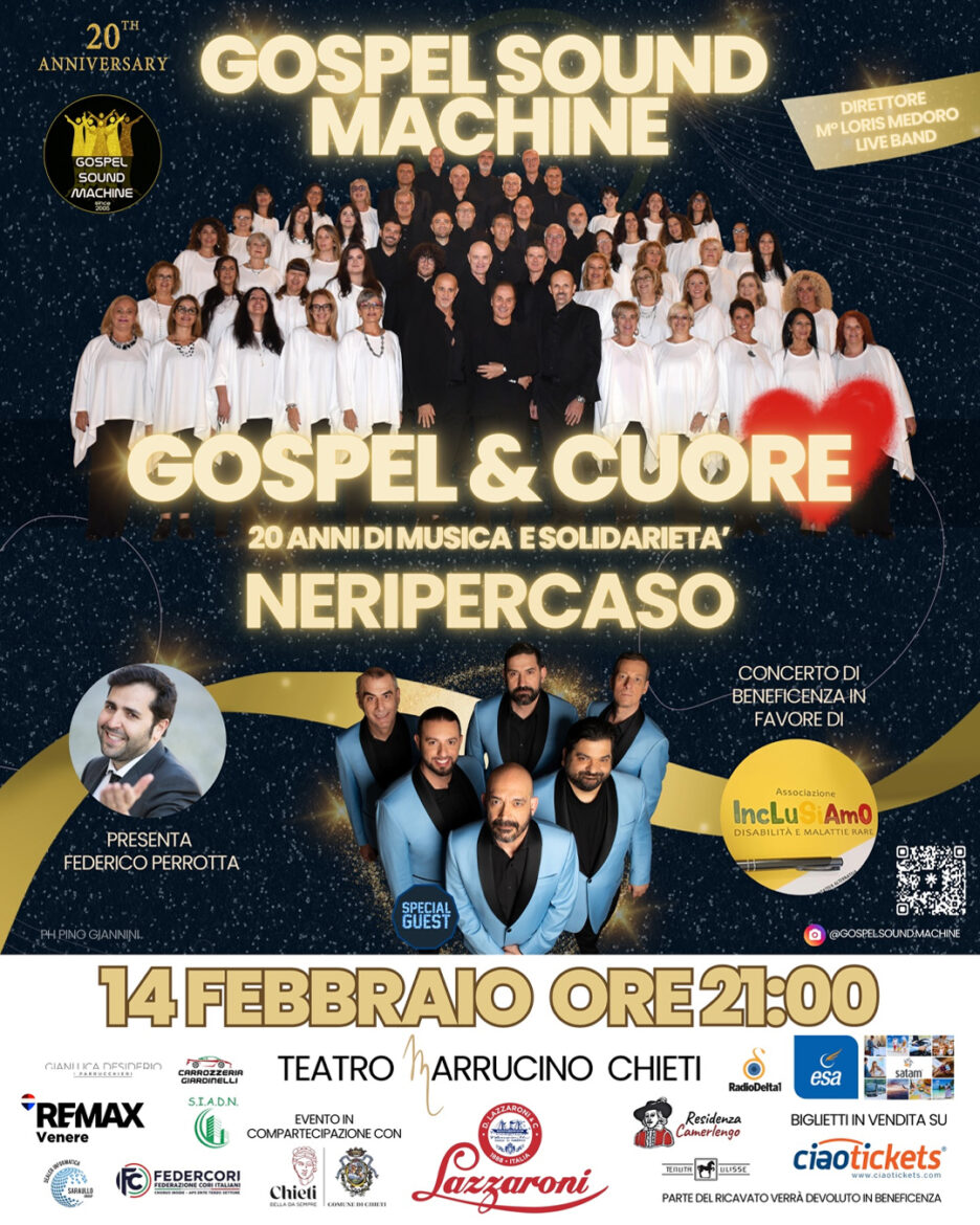 Il 14 febbraio il Teatro Marrucino di Chieti si riempie di emozioni con il concerto celebrativo dei Gospel Sound Machine, insieme agli straordinari Neri Per Caso.