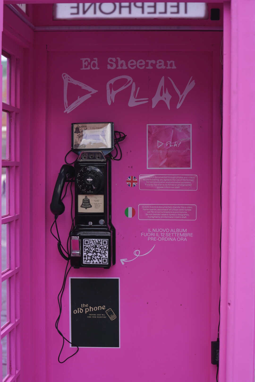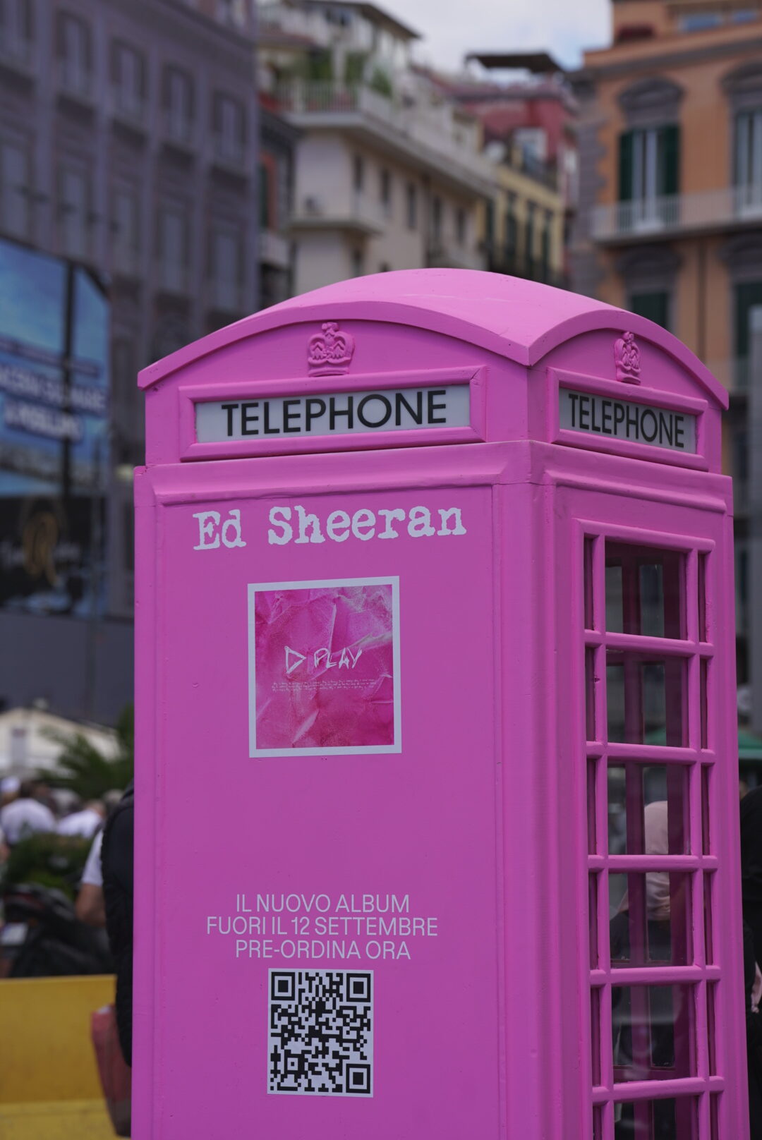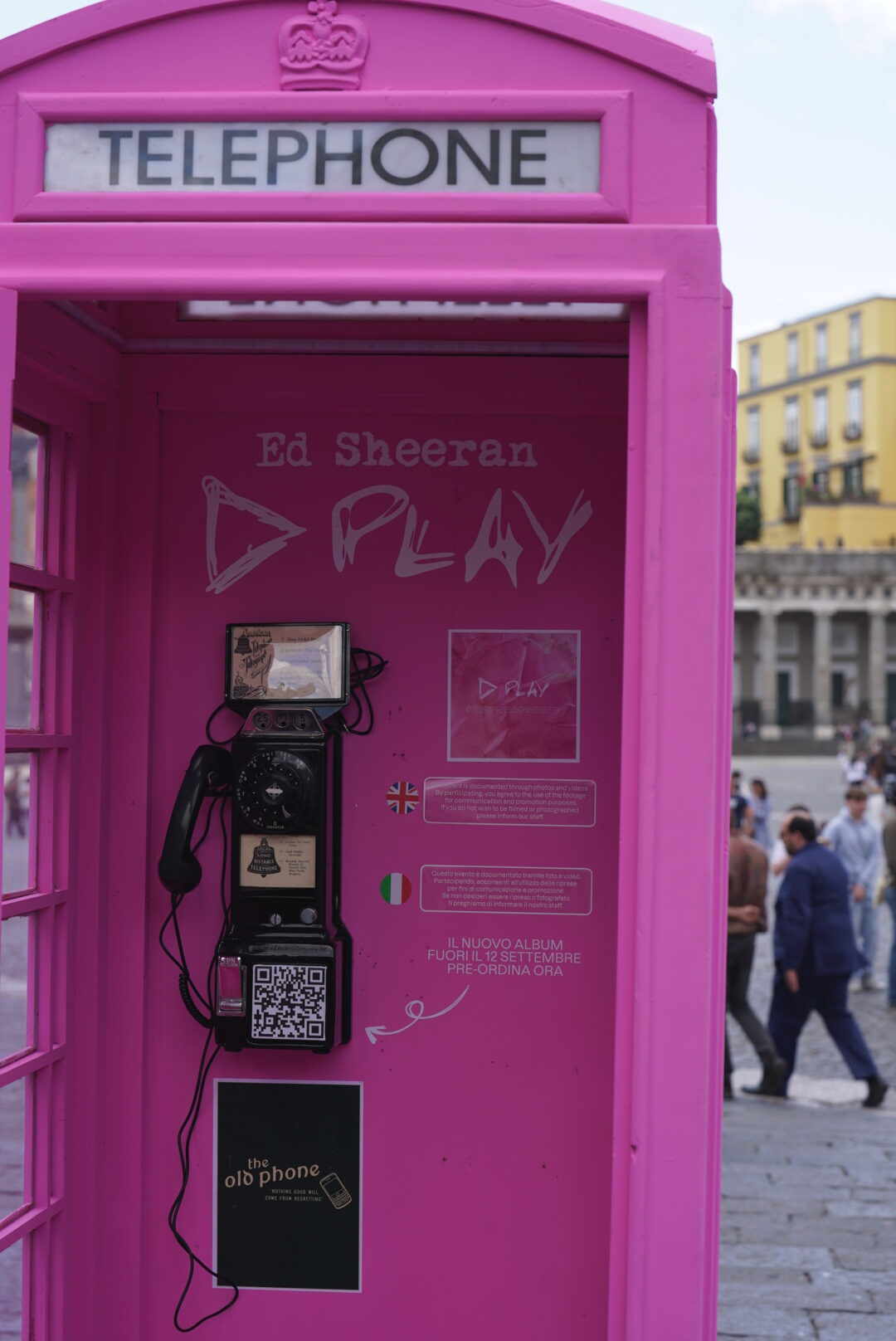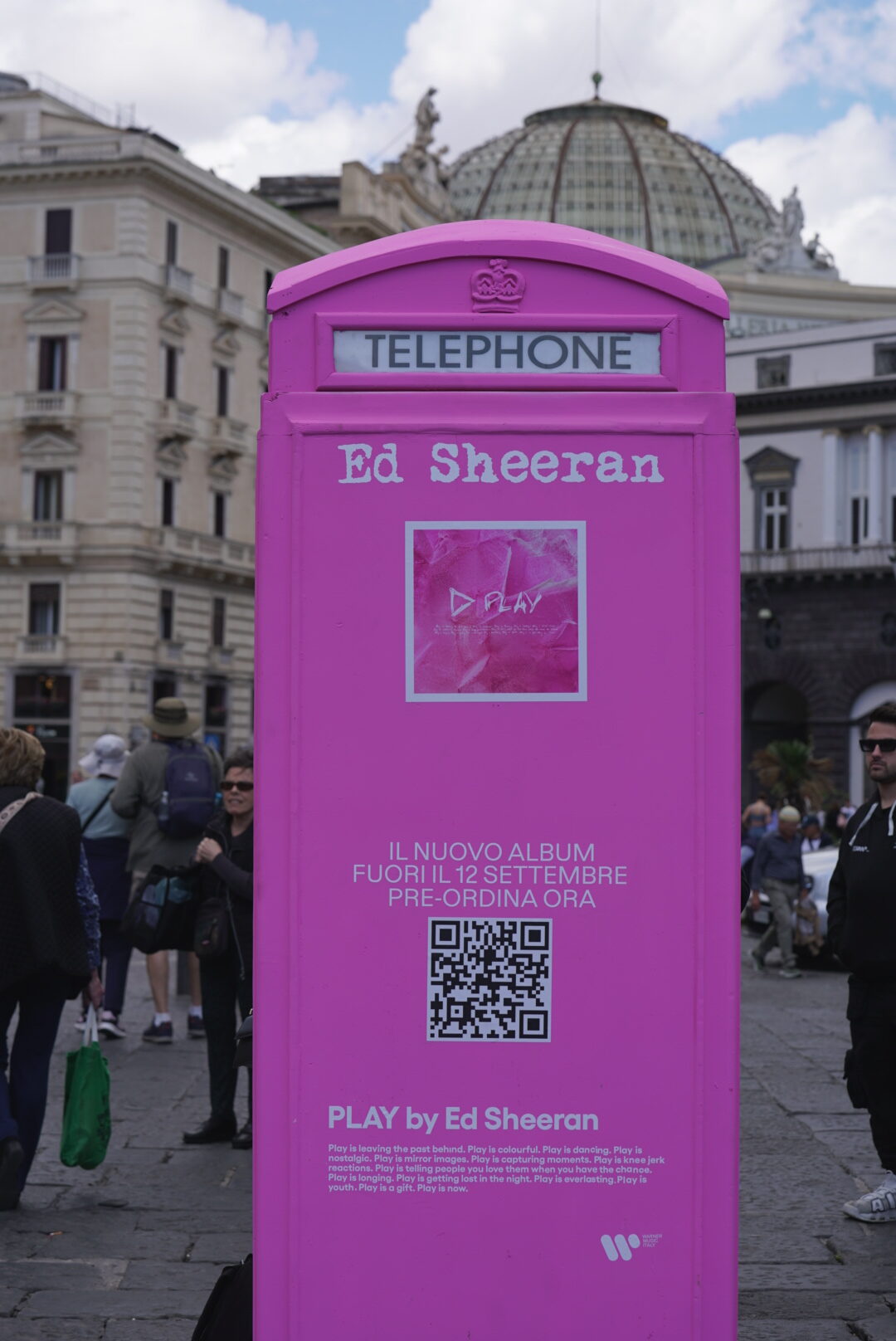 A Napoli, intanto, in Piazza Plebiscito, è apparsa una cabina telefonica inglese rosa come la cover dell’album Play.  All’interno, a partire da domani, si potranno ascoltare dei messaggi di Ed e un’anteprima di alcuni brani del disco. disco.