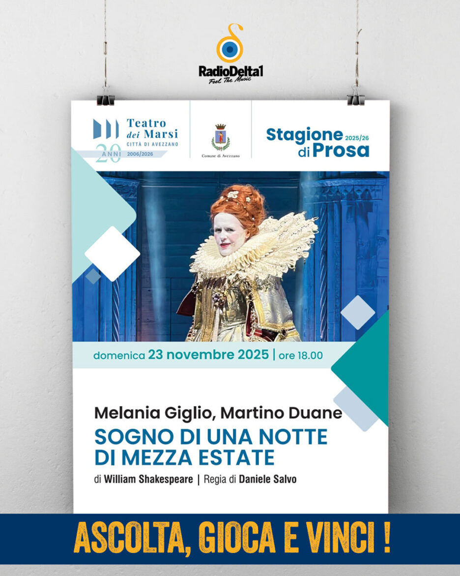 La grande prosa torna protagonista ad Avezzano e Radio Delta 1 è pronta a far vivere ai propri ascoltatori un’esperienza unica. Nell’ambito della Stagione di Prosa 2025/2026 del Teatro dei Marsi, domenica 23 novembre 2025, alle ore 18.00, andrà in scena “Sogno di una notte di mezza estate”, una delle opere più amate di William Shakespeare.
